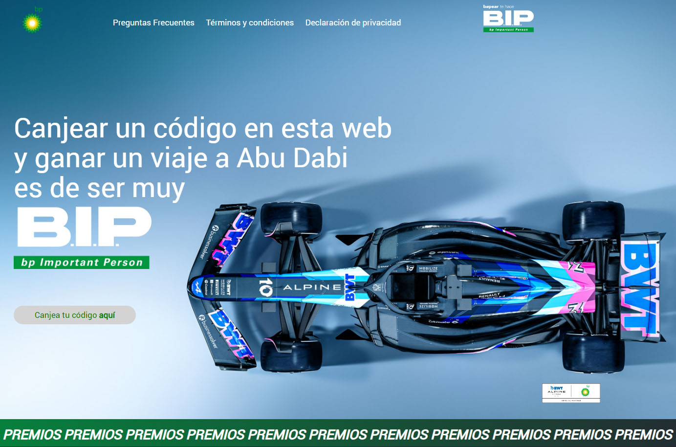 Las gasolineras BP han lanzado la promoción BePear con el sorteo de viajes espectaculares y bonos de gasolina al introducir códigos siguiendo los pasos que te indicamos a continuación. No te pierdas la oportunidad de ganar premios entre los 4.500 cupones carburante BP de hasta 100€ para repostar gasolina/diesel gratis, 3 viajes a Abu Dabi para 4 personas cada una (valoradas en 16.000€) para vivir una experiencia VIP en la gran final del motor o un viaje para 4 personas a Valencia con experiencia VIP en el paddock del equipo Aprilia Racing MotoGP.