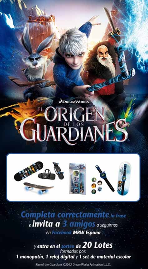 Con el concurso de MRW puedes ganar 20 lotes de «El Origen de los Guardianes», formados por: un monopatín, un reloj y un set escolar. Para ser uno de los ganadores realiza los siguientes pasos: